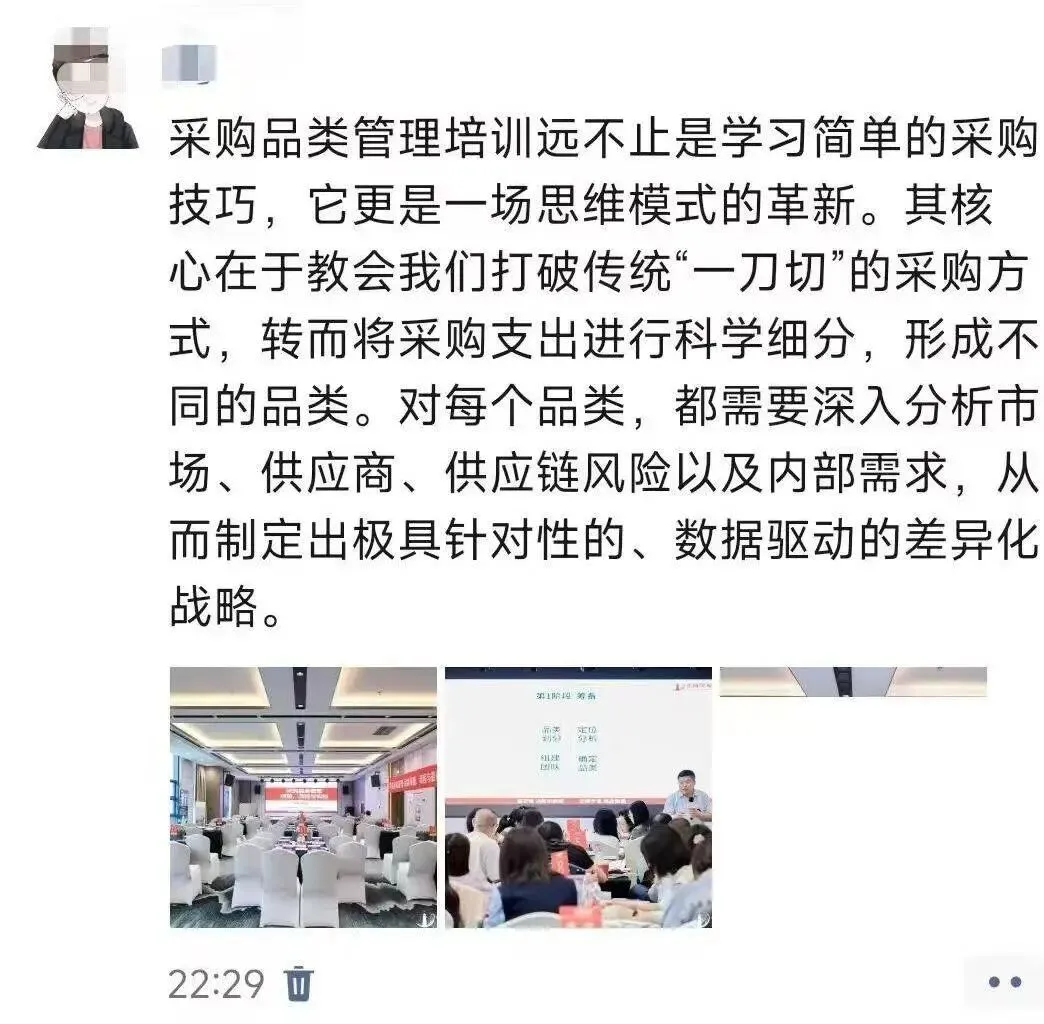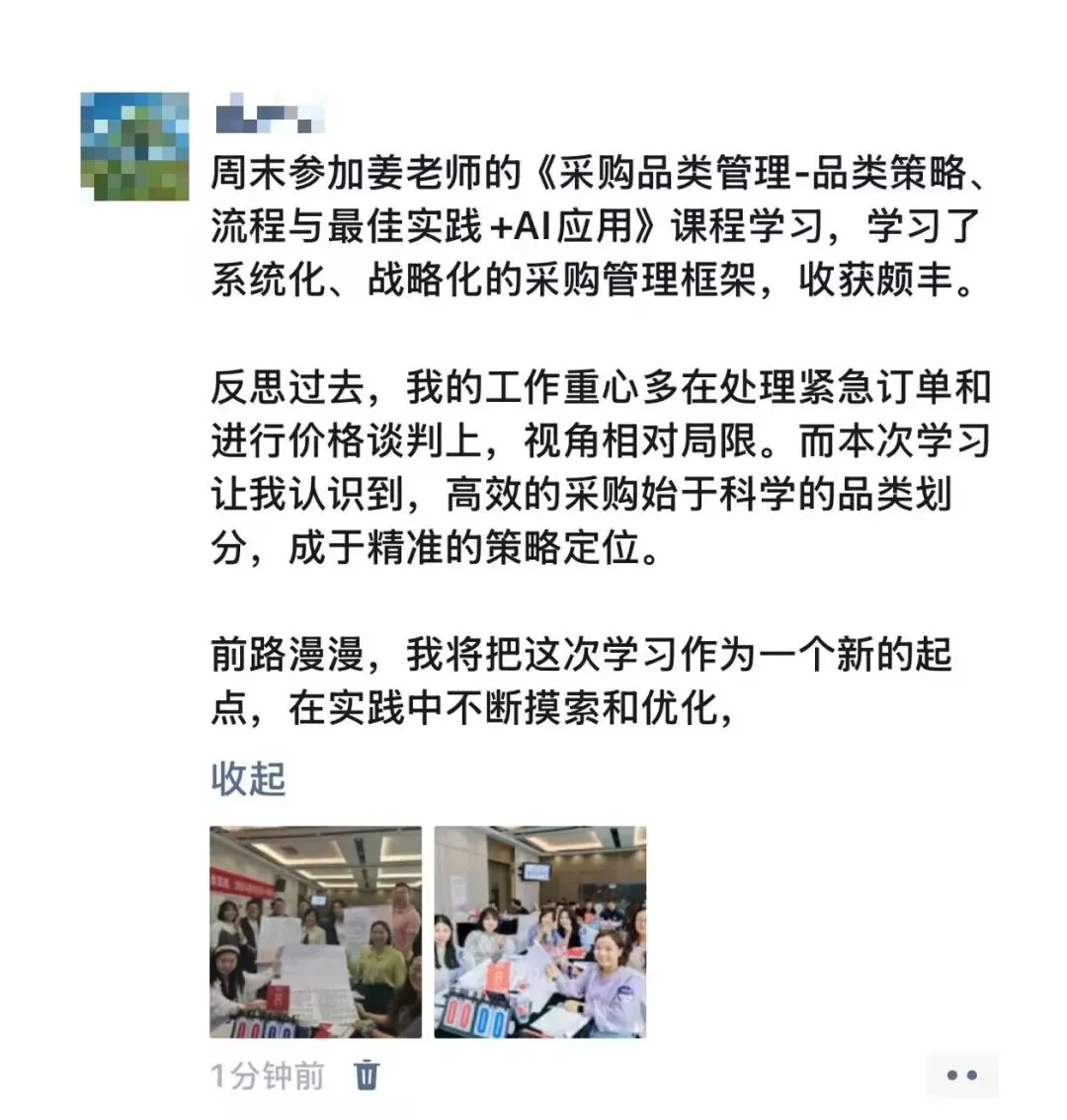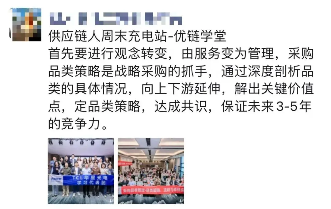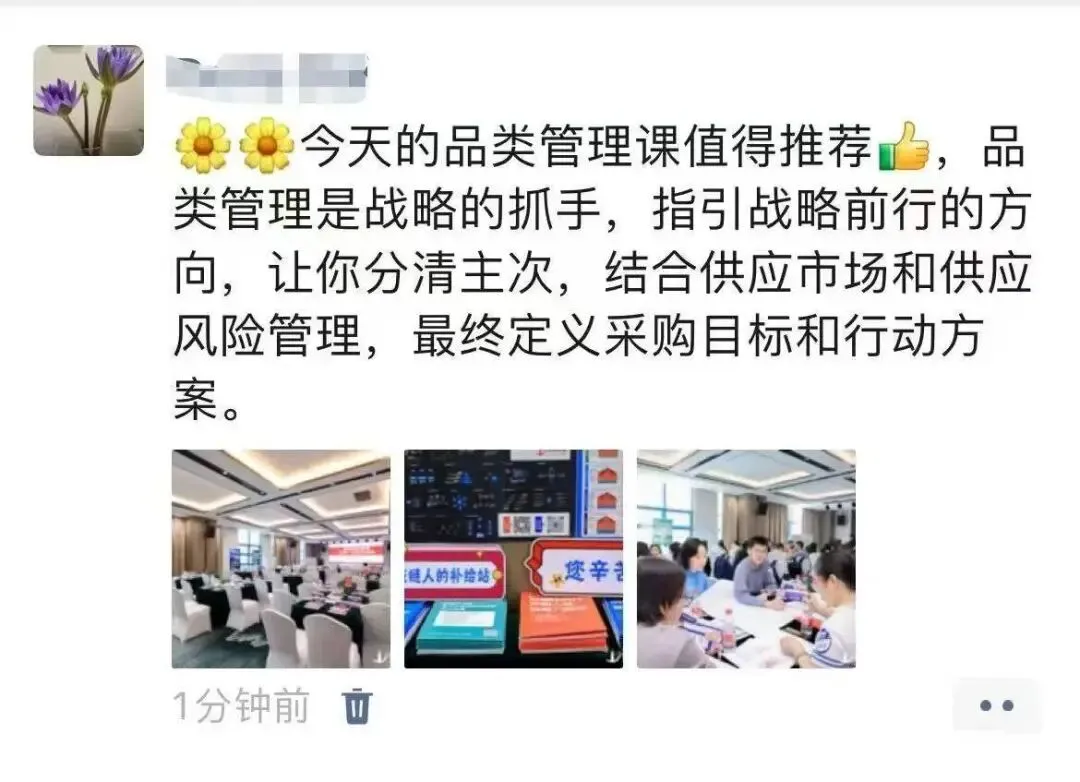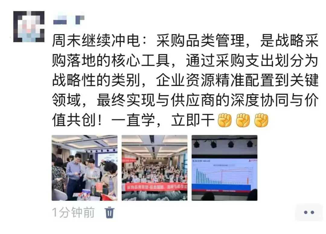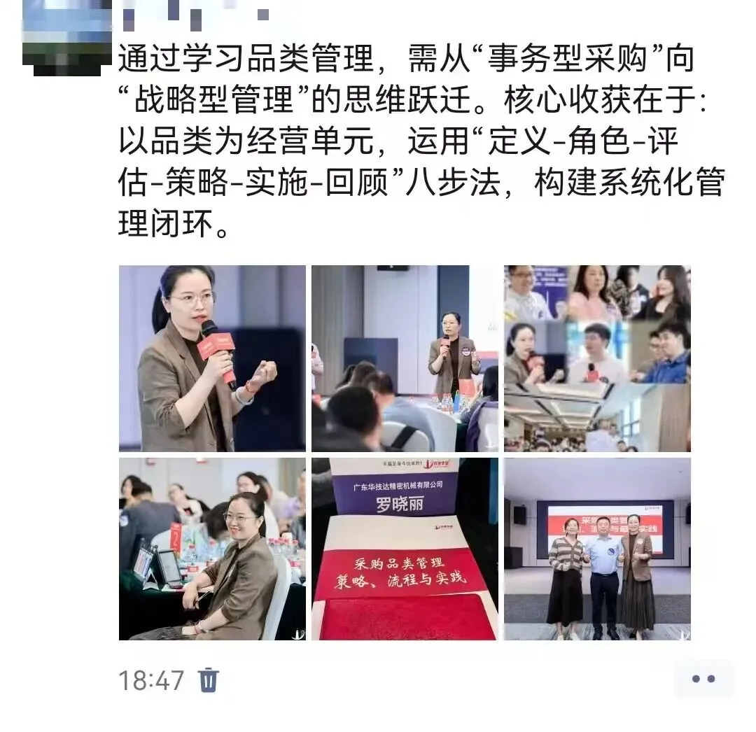 姜老师通过持续不断地深入企业辅导,落地提炼出来一套行之有效的采购品类管理体系、策略和方法,辅导企业每年做品类报告、品类策略大赛、品类管理案例集,深度融入企业的组织基因中。不仅帮企业提升了采购团队的专业度,解决了跨部门的协同问题,更帮企业实现了精准降本增效的难题。