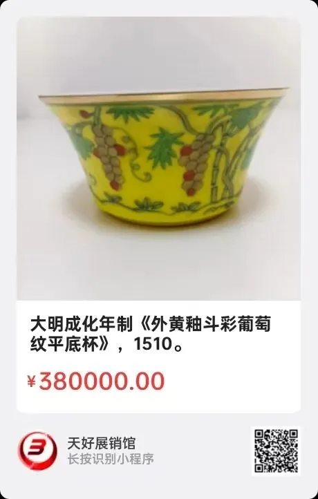 大明成化年制《外黄釉斗彩葡萄纹平底杯》,高4㎝,口径8.2㎝,平底径4.2㎝,重30.1克。简介:以上黄釉地暗紫色葡萄纹杯,是明代成化年间(公元1465~1487年),为宫廷特造,口杯造型精巧典雅,胎体轻盈匀净,釉质莹润,黄釉色突显皇家气派,在绿色枝蔓衬托下,几串葡萄点缀着几颗姹紫色葡萄,十分耀眼醒目,累垂之景画面生动灵性,色彩斑斓,象征着丰收与吉祥。杯内白釉地,内底蓝色圈内又一葡萄丰收图案,杯口沿处蓝色圈围,内饰红黄绿紫色小梅花边,细腻繁丽,下边红色楷字“御赐钱太后专用”。底绿色戳款:大明成化年制。此平底杯从器型,彩绘与文字都清楚彰显了拥有者身份的尊贵!寓意多子多福,富贵祥瑞!来源1510.V。