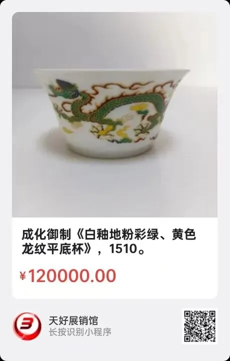 成化御制《白釉地粉彩绿、黄色龙纹平底杯》,高4.3㎝,口径8㎝,底径4.6㎝。简介:此大明成化年御制平底杯,胎质细腻,白釉地润泽,杯体束腰撇口,两侧分别绘绿、黄色龙雲纹,彰显皇家雍容华贵。杯底环型饰金字:“宪宗皇帝登基隆庆上品佳器”,中心:“宫廷御制”。说明了上述官窑瓷器的珍贵含义及重要的历史意义!来源1510.V。