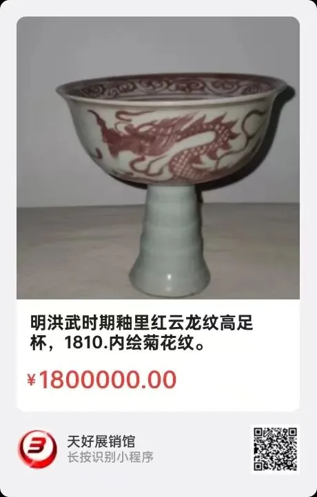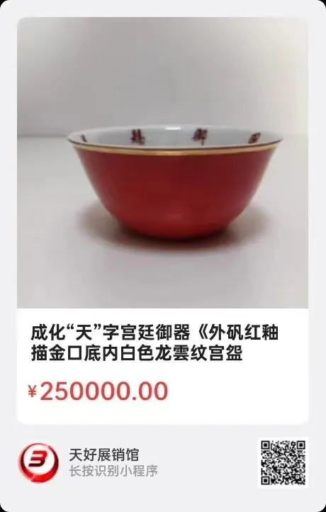 成化“天”字宫廷御器《外矾红釉描金口底内白色龙雲纹宫盌》(压手杯),高3.8㎝,口径8.8㎝,底径3.8㎝,重34.4克。简介:明代宪宗皇帝用“天”字落款皇家自用瓷器,此件宫盌亦称“压手”杯,胎薄轻巧,刚好手握平托,矾红釉色鲜艳夺目,描金口底,突显雍容华贵。杯内璧白彩描绘龙雲纹,口沿内红字楷书:“御赐万贵妃专用”。体现宫廷内等级区别与显贵。此瓷器工艺精湛,优雅端庄秀丽,高雅精美之佳器配给贵妃使用,彰显了皇帝的皇权与厚恩!此压手杯典雅珍贵!具有极高的艺术价值!来源1510.V。