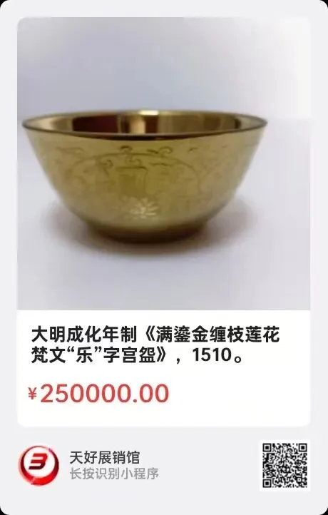大明成化年制《满鎏金缠枝莲花梵文“乐”字宫盌》,高3.82㎝,口径8.1㎝,平底径3.9㎝。简介:大明成化年制《满鎏金缠枝莲花法轮梵文宫盌》是成化官窑小型瓷器的精品。内底莲荷法轮绘画,外缠枝花卉嵌梵文,音“仰”,意"喜”,表达吉祥如意,喜气洋洋之寓意!满鎏金彩上绘画,疏密有致,笔意与层次清新,工艺精湛,富贵侈华,是成化官窑的精品宝器,让人爱不释手!来源1510.V。