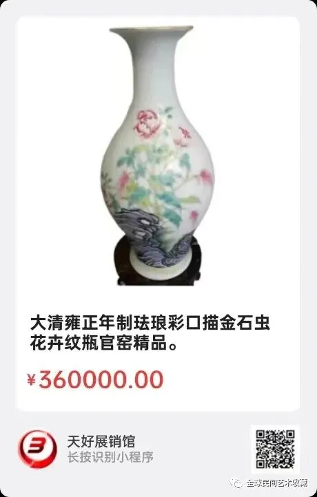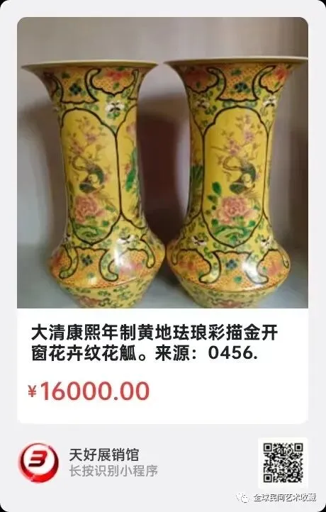 清雍正黄釉兰料珐琅彩长颈方瓶,瓶高16厘米,该瓶造型优美,小巧玲珑,胎体较厚,黄釉兰料珐琅彩釉质肥厚,亮丽。画工精细,是标准的雍正官窑制作方式。全手工制作,修足规范精细。胎质洁白细腻,呈糯米质,底款采用兰料珐琅彩楷书书写雍正年制四字款是标准的雍正官窑珐琅彩书写方式。属于皇宫自家用款,比六字款的档次更高,更少。方瓶结构制作难度大,有一方顶十圆的说法,存量更希少。全国各地几十年的拍卖公司都没见过此类雍正黄釉兰料珐琅長颈方瓶,胎底淡淡的火石红显得各外自然优雅,就是口部的珐琅彩有点木色,口金有点自然磨损,不太影响整体美,整体包浆醇厚自然到代!全品!是件难的雍正珐琅彩長颈方瓶,而且是件精品!珍品!罕见的品种!2025年 12月31日,经天好评审团评审,以6票优势荣登精品榜,获第196期天好海选精品。来源1719.V。
