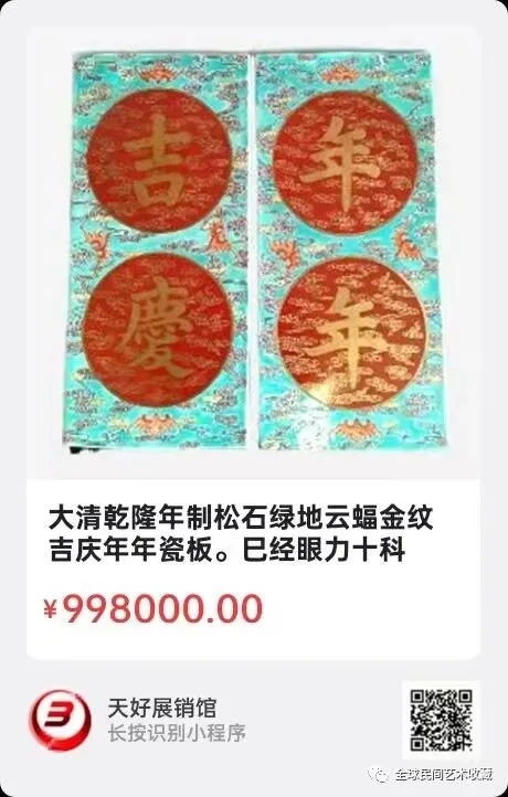 大清乾隆年制松石绿地云蝠金纹吉庆年年瓷板。巳经眼力十科检十微观确真,属唐英制作。是清代重器。高54厘米,厚近1厘米,宽50厘米。富丽堂煌,色彩艳丽,云蝠纹大方生动,瓷板规整,属官窑精品无疑,是富贵人家首选,年年吉庆。保存完好,实属不易。注,是北京太平洋拍卖会图录封面。雅昌网可查阅。来源:0456。V 。
