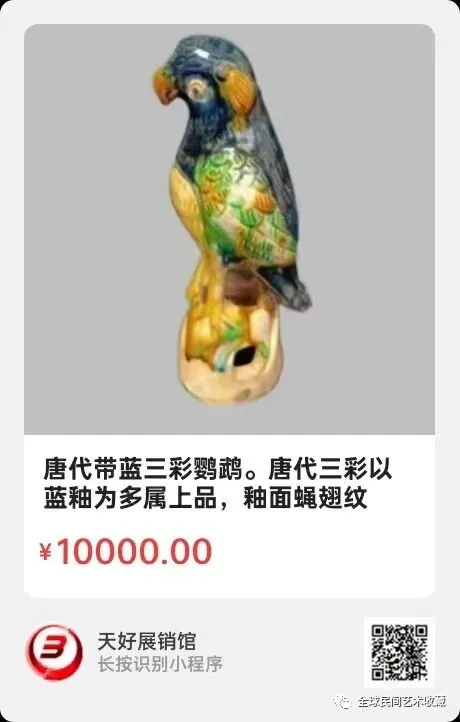 唐代带蓝三彩鹦鹉。高23厘米。唐代三彩以蓝釉为多属上品,釉面蝇翅纹明显,造型精致惟妙惟肖,灵动可爱。不可多得。保存完好。来源:0456。V 。