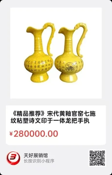 宋代黄釉官窑七施纹粘塑诗文印于一体龙把手执壶一对。高23厘米,口径7厘米,足径7.3厘米,底部双款,政和,御书,壶身瘦金体落天下一人款。造型极其精美,实属皇家欣赏之宝。2025年 12月31日,经天好评审团评审,以6票优势荣登精品榜,获第196期天好海选精品。来源0456.V。