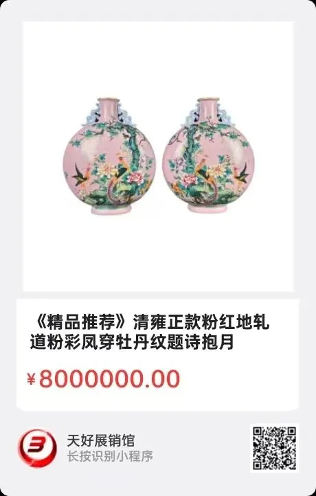 清雍正款粉红地轧道粉彩凤穿牡丹纹题诗抱月瓶(一对),此对抱月瓶高32.2厘米,宽26.5厘米,厚12厘米,口径6厘米,底径11.5x7.8厘米,单重3.36千克。瓶型规整,粉红地轧道工艺细腻,纹饰对称,绘凤穿牡丹图,凤凰神态灵动,牡丹色彩艳丽,另一面配题诗印章。底落“大清雍正年制”青花款。整体集轧道、粉彩于一身,工艺精湛复杂,画面寓意吉祥,是雍正朝粉彩官窑的巅峰之作,具有极高的艺术与收藏价值。2025年 11月12日,经天好评审团评审,以6票优势荣登精品榜,获第190期天好海选精品。来源1507.V。