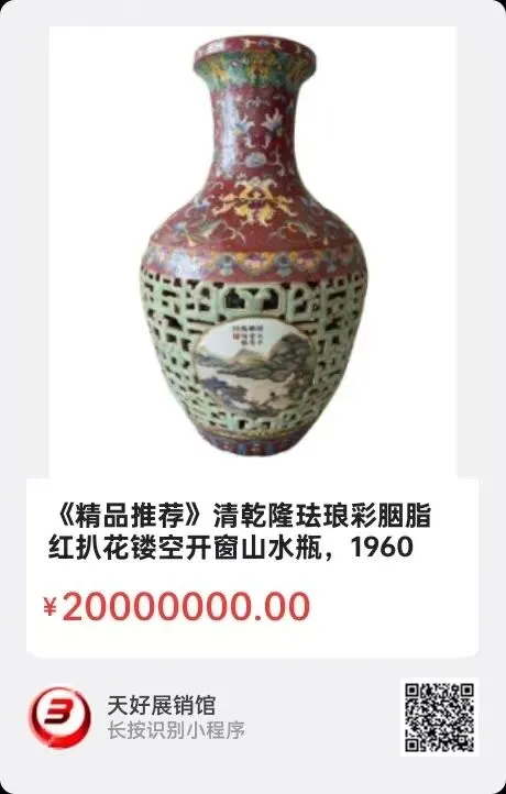 清乾隆珐琅彩胭脂红扒花镂空开窗山水瓶,尺寸高38cm腹径19cm底径14cm口径12cm。2026年 1月7日,经天好评审团评审,以6票优势荣登精品榜,获第197期天好海选精品。来源1960.V。
