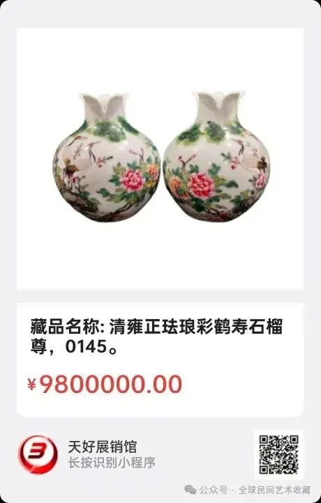 清乾隆粉彩石榴纹天球瓶,高56厘米,直径42厘米,重21斤,是乾隆官窑粉彩瓷的典范之作。其器型饱满规整,天球瓶制式尽显雍容气度,为清代宫廷陈设瓷的经典器型。纹饰以“多子多福”的石榴为主题,粉彩施彩细腻晕染,粉红石榴与翠绿枝叶相映,籽粒刻画纤毫毕现,既显写生之趣,又含吉祥寓意。底落“大清乾隆年制”篆书官款,款识规整,是乾隆官窑的标准标识。整体工艺精湛、画工灵动,集乾隆粉彩“料色丰富、绘工精细”之所长,兼具艺术审美与宫廷器的华贵气质,是清代盛世瓷艺与吉祥文化结合的精品,收藏价值颇高。2025年 12月3日,经天好评审团评审,以6票优势荣登精品榜,获第193期天好海选精品。来源1507.V。