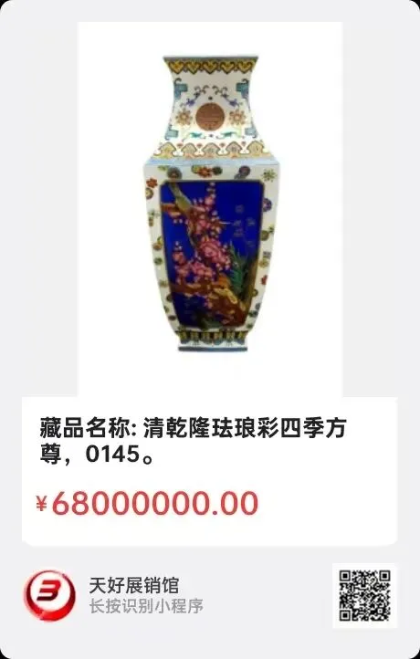 藏品名称: 清乾隆珐琅彩四季方尊,藏品尺寸: 高56cm,藏品描述:此藏品体型硕大,雕工一流,精稀珍贵。来源0145.V.