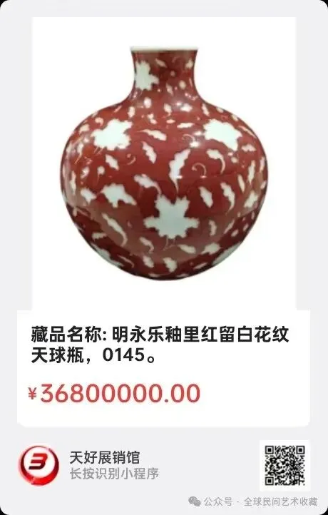 藏品名称: 明永乐釉里红留白花纹天球瓶,藏品尺寸: 高45cm 腹径42cm,来源0145.V.