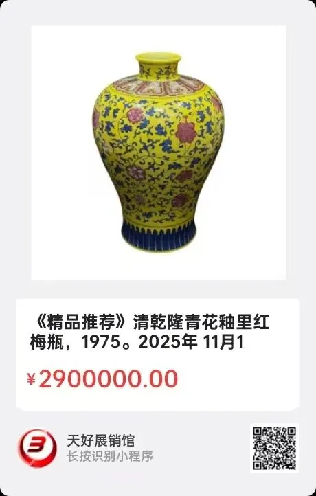 清乾隆青花釉里红梅瓶,高46.4厘米,口径10.3厘米,底径20厘米,瓶肩直径31.2厘米,重量9kg。在清代,明黄是皇家专用色,普通百姓不可使用,由御窑厂工匠对釉料配比和窑温的精准把控才能烧成。青花釉里红梅瓶将青花和釉里红呈现在同一件瓷器上,体现出当时烧造瓷器的高超技艺。青花枝蔓缠绕不绝,釉里红花瓣形态饱满美观,缠枝花卉纹寓意“生生不息、福寿延绵”,这是皇家高级审美,是当时国力与技艺的见证。2025年 11月12日,经天好评审团评审,以8票优势荣登精品榜,获第190期天好海选精品。来源1975.V。