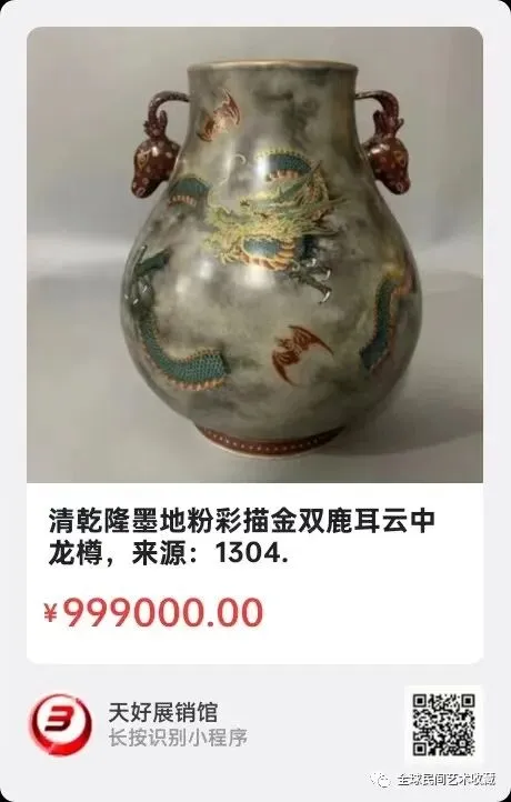 清乾隆洋彩粉青透龙夹层吉庆有余玲珑尊,高 42 厘米,口径 12.5 厘米、底径 13.5 厘米,属乾隆御窑巅峰之作,以1.366亿港元天价成交。它采用“瓶中有瓶”的透雕夹层工艺,外层镂空夔龙纹,内层藏青花缠枝纹,工艺集洋彩、镂空、描金等于一身,焙烧难度极高。颈部黄地锦纹缀“吉”字、蝙蝠、双鱼,腹部开窗绘鱼藻,融“吉庆有余”祥瑞寓意;洛可可式洋花又显中西艺术交融。底署“大清乾隆年制”款,存世极少、多藏博物馆,是18世纪制瓷工艺与宫廷美学的集大成者,堪称“鬼斧神工”的瓷中瑰宝。2025年 11月19日,经天好评审团评审,以6票优势荣登精品榜,获第191期天好海选精品。来源1507.V。