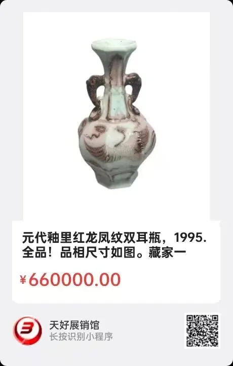 明洪武釉里红松竹梅玉壶春瓶。瓶高33厘米,该瓶造型优,胎体较厚,釉里红釉质肥厚,亮丽。画工精细,是标准的洪武官窑制作方式。全手工制作,修足规范精细。胎质洁白细腻,麻昌土质,从造型画工釉里红的发色是标准洪武官窑的制作方式。釉里红的烧制难度更大,存量比青花更少,更希少,收藏价值和经济价值更高。胎底淡淡的火石红显得各外自然优雅,整体包浆醇厚自然到代!是件难的明洪武釉里红松竹梅玉壶春瓶,而且是件精品!珍品!全美品!罕见的品种!2026年 1月14日,经天好评审团评审,以8票优势荣登精品榜,获第198期天好海选精品。来源1719.V。