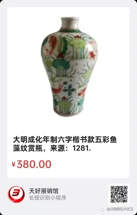 大明成化年制六字楷书款五彩鱼藻纹赏瓶,高16cm足径3cm,来源:1281.
