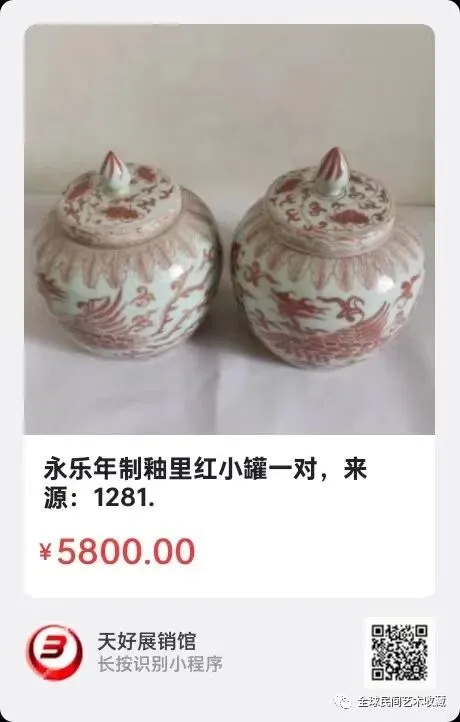 永乐年制釉里红小罐一对,高15厘米足径9厘米,来源:1281.