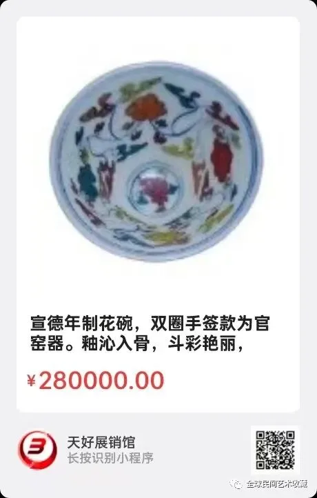 宣德年制花碗,双圈手签款为官窑器。高6公分宽,碗面直径10公分。釉沁入骨,斗彩艳丽,存世稀小。来源:1035.