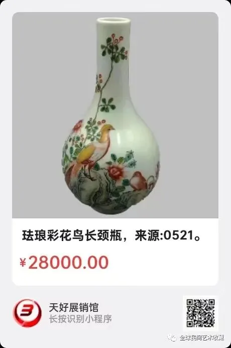珐琅彩花鸟长颈瓶,直径12cm,高24cm,来源:0521。