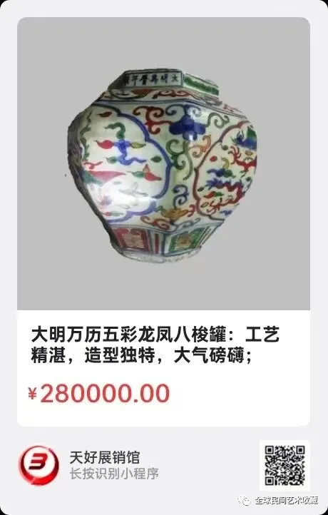 大明万历五彩龙凤八梭罐: 高23㎝,口径15㎝、底径13㎝。工艺精湛,造型独特,大气磅礴;从胎质、釉色丶五彩龙凤图纹等综合赏析,为明代瓷器上品。五彩图纹明朗繁缛,包浆古朴,不褪包。其口沿处有“大明万历年制”六字,符合明代书法特征。 藏宝者:尹本顺(尹笋君,74岁)。来源:0169。