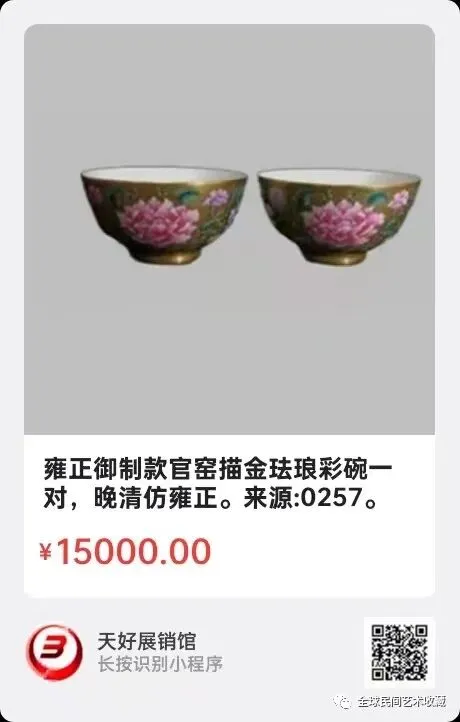 雍正御制款官窑描金珐琅彩碗一对,口径10厘米,晚清仿雍正。来源:0257。