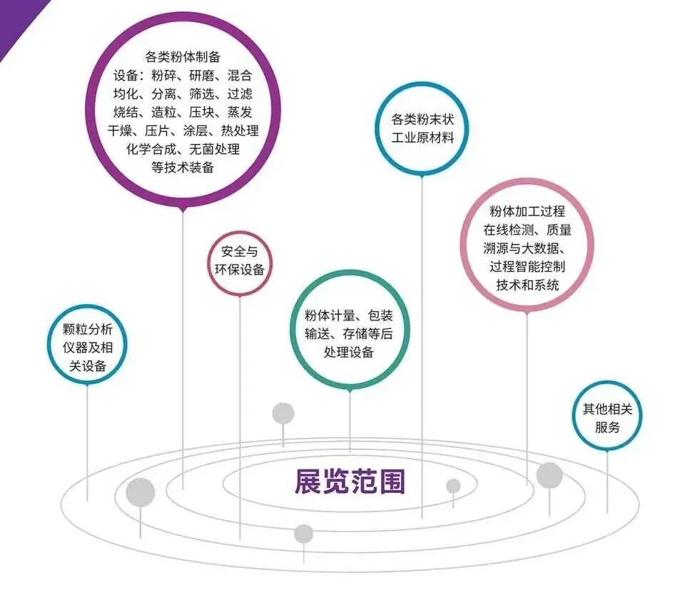 展览内容涵盖各类粉体原材料、粉体加工设备、储运辅助设备、检测与分析仪器、耗材辅料、再制造二手设备,以及中试研发、科技服务、专业人才培养等机构,形成等一体化全产业链信息服务。为上下游企业搭建全方位商贸交流平台,共享多维交叉的广阔市场,缔造海量商机和一站式综合服务平台。