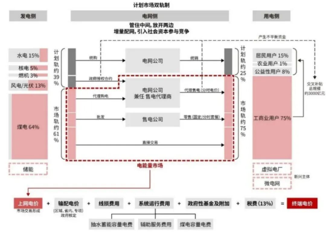 首先给大家分享一下电力市场架构图,这张图由发电侧、电网侧和用电侧三部分构成,我觉得所有的电力市场化改革都是围绕这张图进行的。