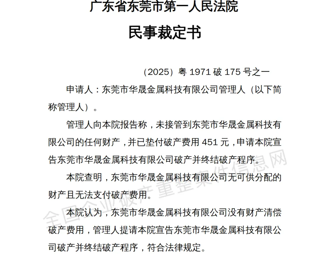 近日,东莞市人民法院一纸裁定,宣告东莞市华晟金属科技有限公司破产并终结破产程序,为这家成立仅五年的五金小微企业画上了句点。