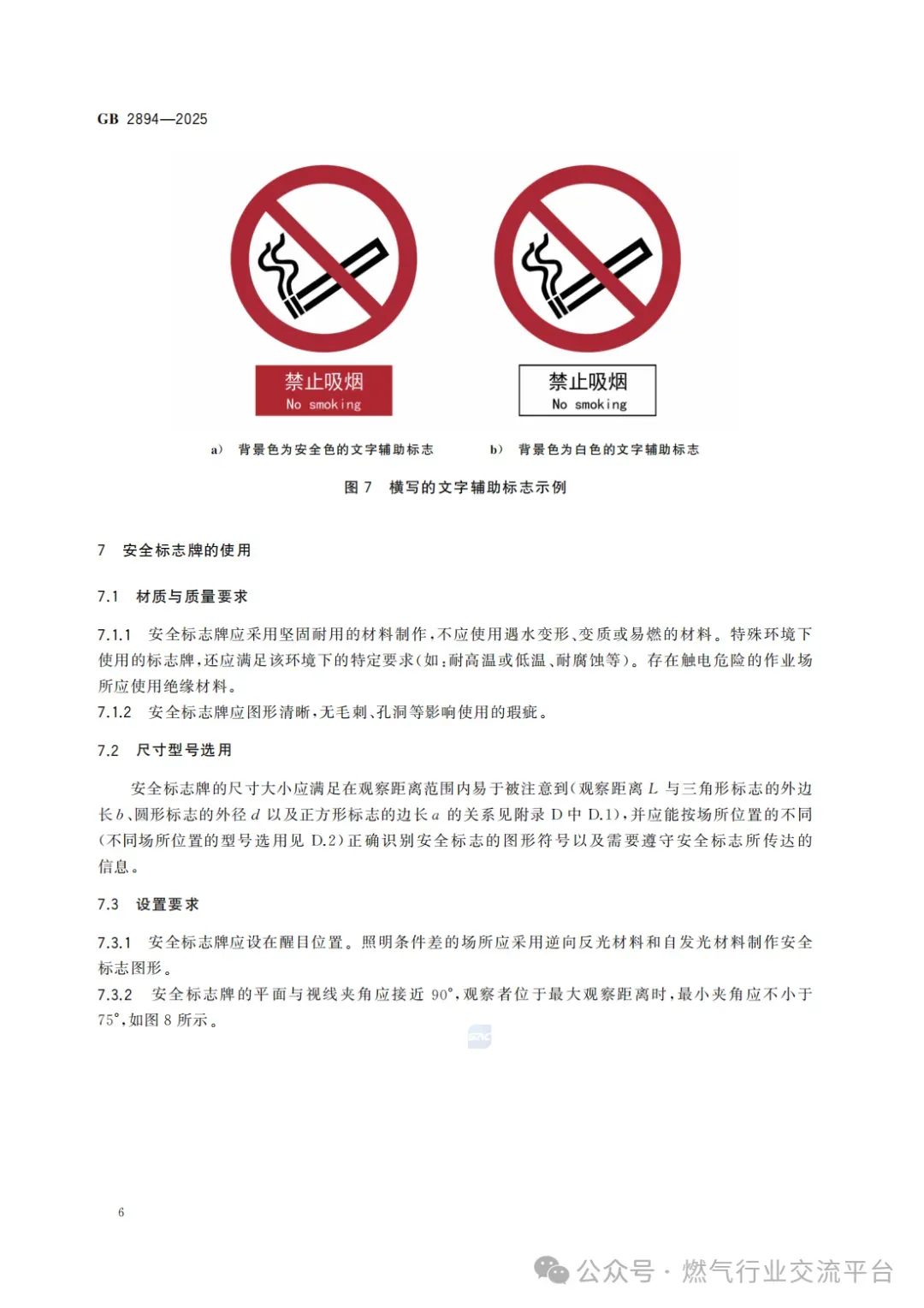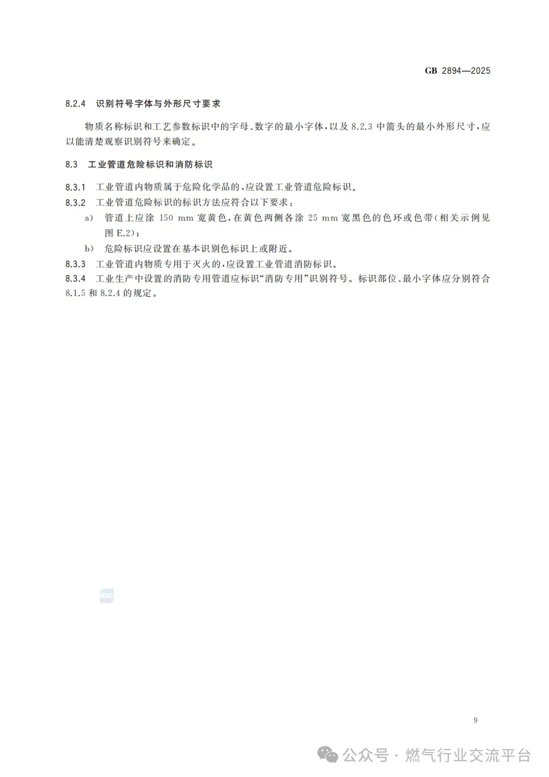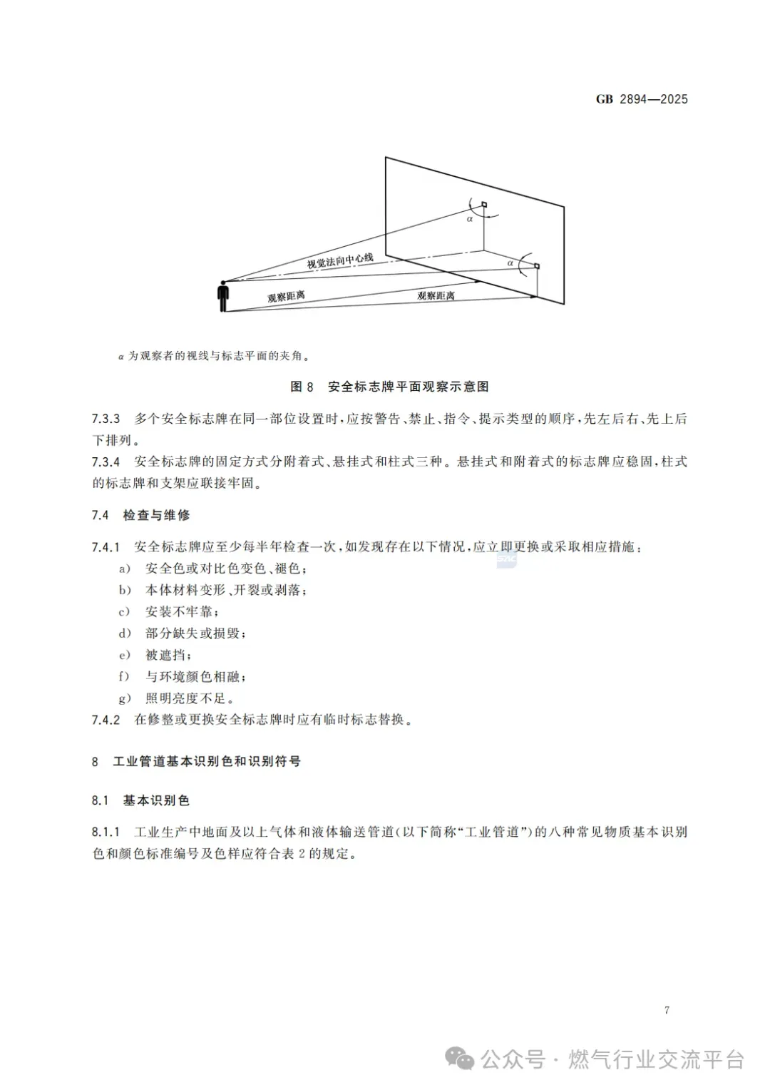 7.技术要求补充 增加了颜色表征的相关要求、照明条件差的场所安全标志的使用要求、安全标志牌的使用、修整或更换要求、工业管道的基本识别色、识别符号和安全标识的相关要求。 强调了标志在不同环境下的有效性,并整合强化了工业管道的安全标识。