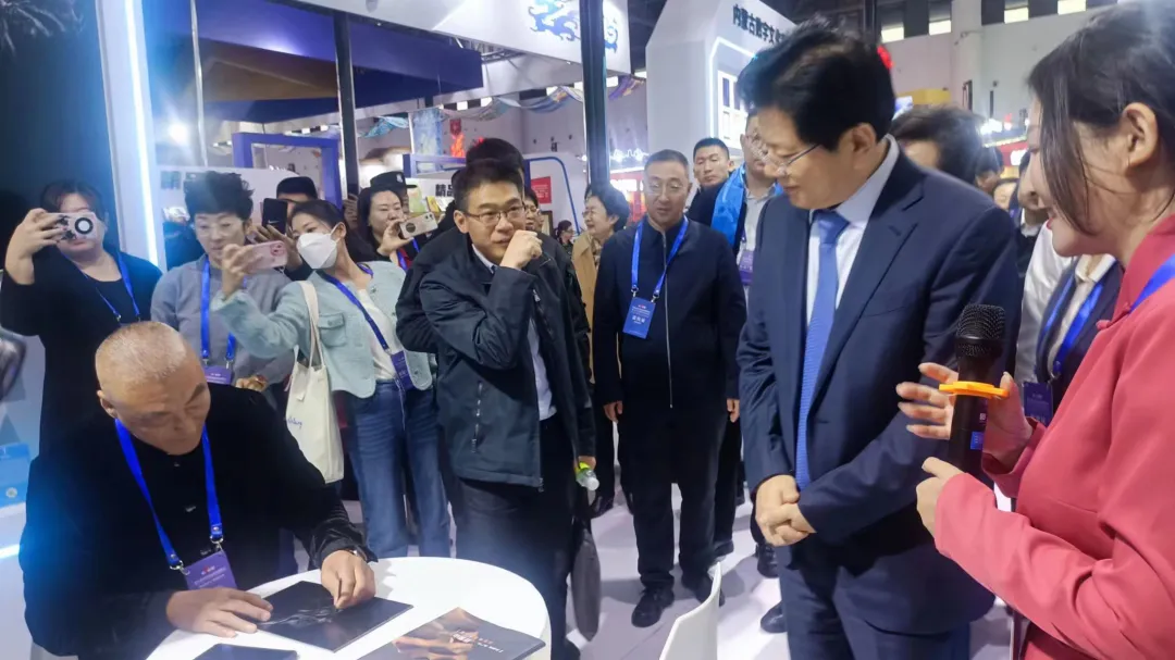 图为中宣部副部长张建春莅临内蒙古展厅观看谷宝山现场制作铝板雕刻作品