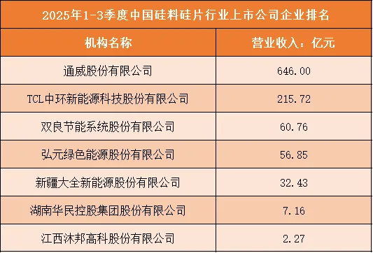 根据申万行业分类,2025年1-3季度中国硅料硅片行业上市公司按营业收入排名如下:(A股上市公司)