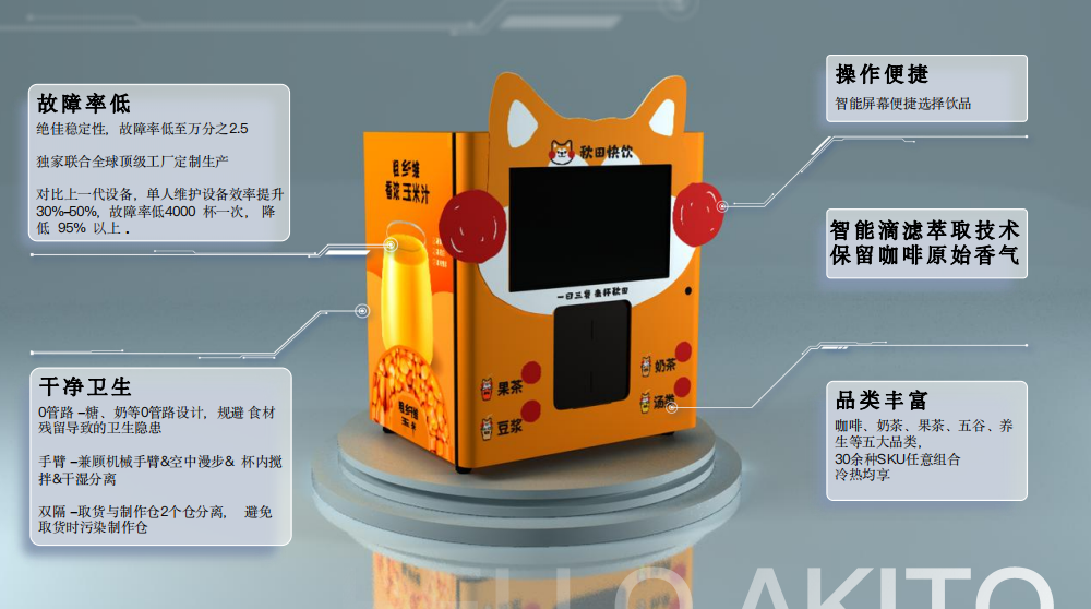 在一片产业蓝海中,秋田快饮作为全国领先的智能现制饮品品牌应运而生,致力于为国人提供全品类、多场景、一站式现制饮品解决方案,做中国人喝得起、喝得好、喝的到的便捷现制饮品。秋田快饮的设备可以制作现磨咖啡、五谷类、奶茶、果茶、汤类等五大品类三十余种饮品,同时可根据要求专属定制独立产品,每季上新,全面满足伴餐饮品需求。秋田快饮目前已为华东罗森便利店、北京多点便利店、安徽巷邻便利店、李先生牛肉面、好适口等知名品牌提供全品服务。