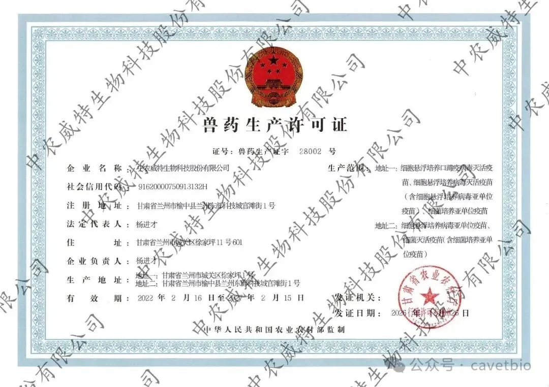 “两证”的换发,标志着中农威特又有2条生产线通过GMP动态验收,至此中农威特公司已拥有细胞悬浮培养口蹄疫病毒灭活疫苗、细胞悬浮培养病毒灭活疫苗(含细胞悬浮培养病毒亚单位疫苗)、细胞悬浮培养病毒亚单位疫苗等5条GMP生产线,还建有已通过GMP静态验收的酵母表达亚单位疫苗、细胞悬浮培养亚单位疫苗、细胞悬浮培养病毒活疫苗、mRNA疫苗4条生产线。