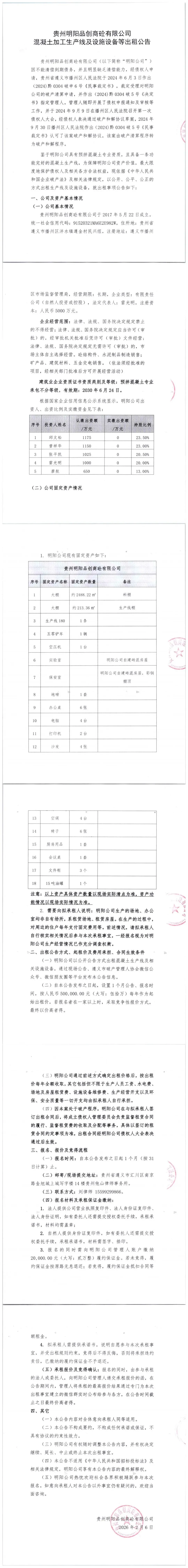 贵州明阳品创商砼有限公司混凝土加工生产线及设备等出租公告