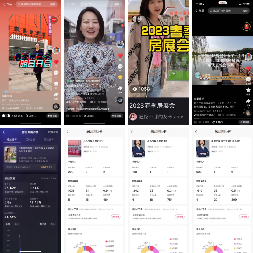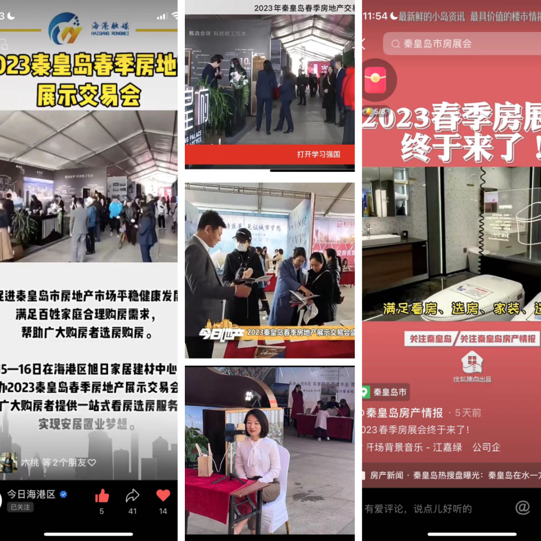 本次房展会运用新媒体宣传起到了良好的效果,抖音前期预热流量就在32.89万人次,快手前期预热流量4.7万人次,协会新媒体前期预热流量5.7万人次,快手直播累计流量5300人次,爱秦皇岛微信公众号直播累计达到1.83万人次,小红书1058人次(以上数据不含参展单位自媒体宣传流量),房展会现场两天人流量约有2000余人。
