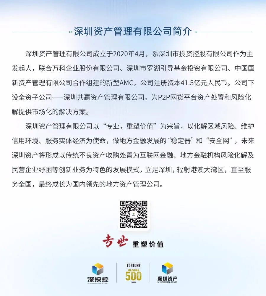作为一家新型资产管理公司,深圳资产自2020年4月成立以来便以“专业,重塑价值”为理念,定位于以不良资产服务为核心的金融风险化解平台,积极发挥股东协同作用,着力维护地方金融稳定,探索开展全方位、多形式的合作,在上市公司企业纾困、上市公司大股东股票质押风险处置、房地产金融风险化解等方面做出了积极的尝试。所属子公司共赢资产管理有限公司积极立足“网贷资产处置市场化解决方案的提供者和重要参与者”的定位,稳步推进网贷平台风险化解工作,科技手段助力清收处置。截至2021年末,公司资产规模已超百亿。