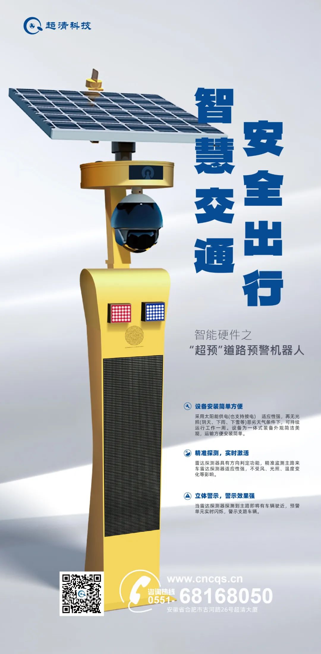 道路预警机器人能实现对公路、城市道路相关危险情况进行提前告知预警,帮助交通参与者看到他看不见 (或看不清) 的状况,如支路来车预警、十字交叉预警、弯道会车预警、干道车辆汇入预警、道路结冰预警、道路涉水预警、道路限高预警等,并以声、光、电等多种形式提示交通参与者注意可能会发生的风险,让其及时发现、提早判断、采取措施、主动规避交通安全事故的发生。此外,超清科技针对该产品配备了一套云预警系统平台,可接入交警后端管控平台,对散落在城市各角落的道路预警机器人进行联网联控,实时监测其运行状况。