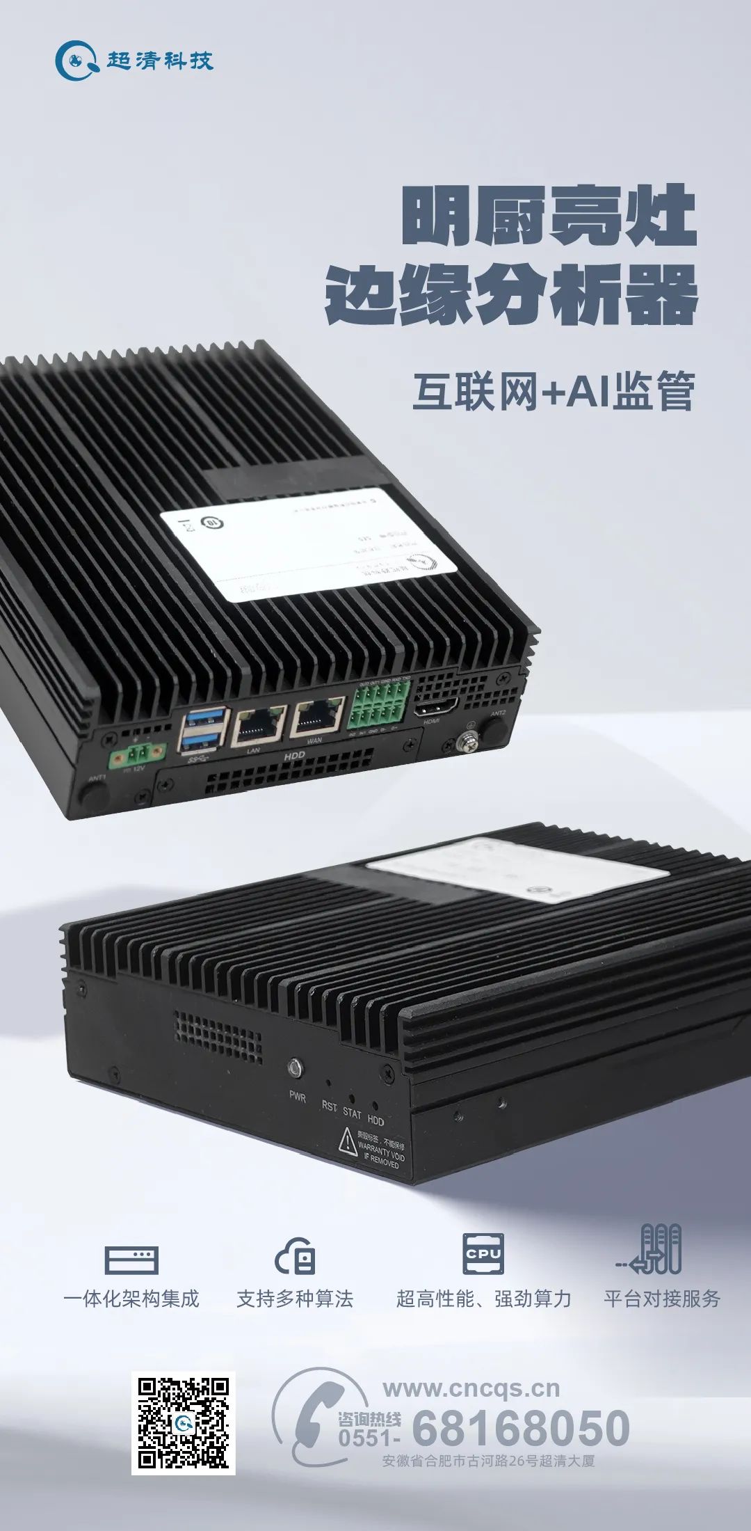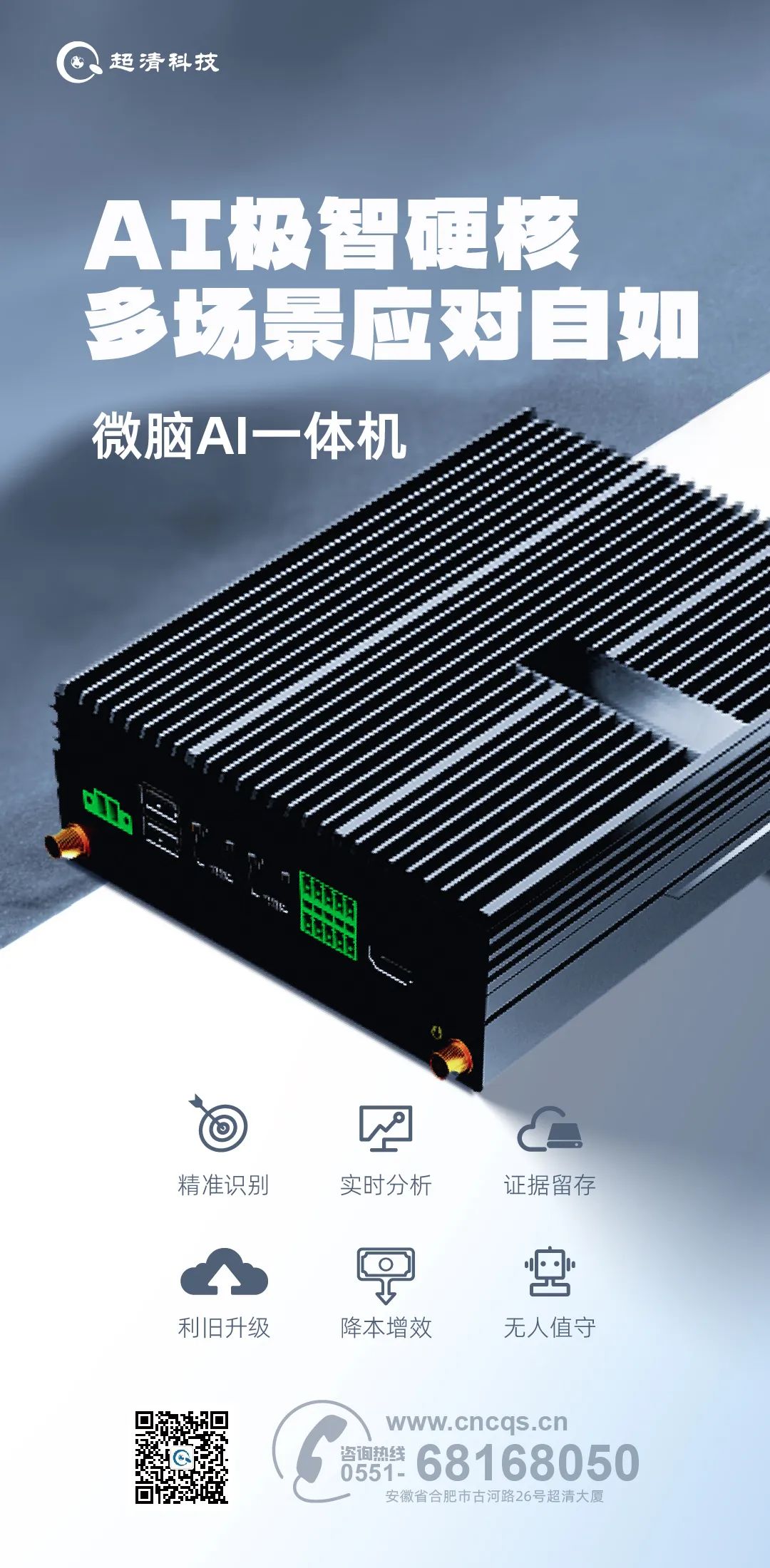 微脑AI一体机是集算法、应用、储存于一体的智能边缘硬件。超清科技采用高算力AI芯片,搭载轻量的边端技术引擎,可接入网络摄像头以提供视频算法分析能力,打造全天候、无盲点、无人值守的AI智慧督导员,是专为小场景智能化升级需求打造的标准、高效、低门槛的边缘AI赋能利器。