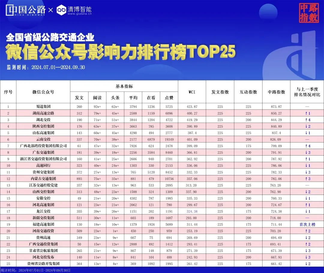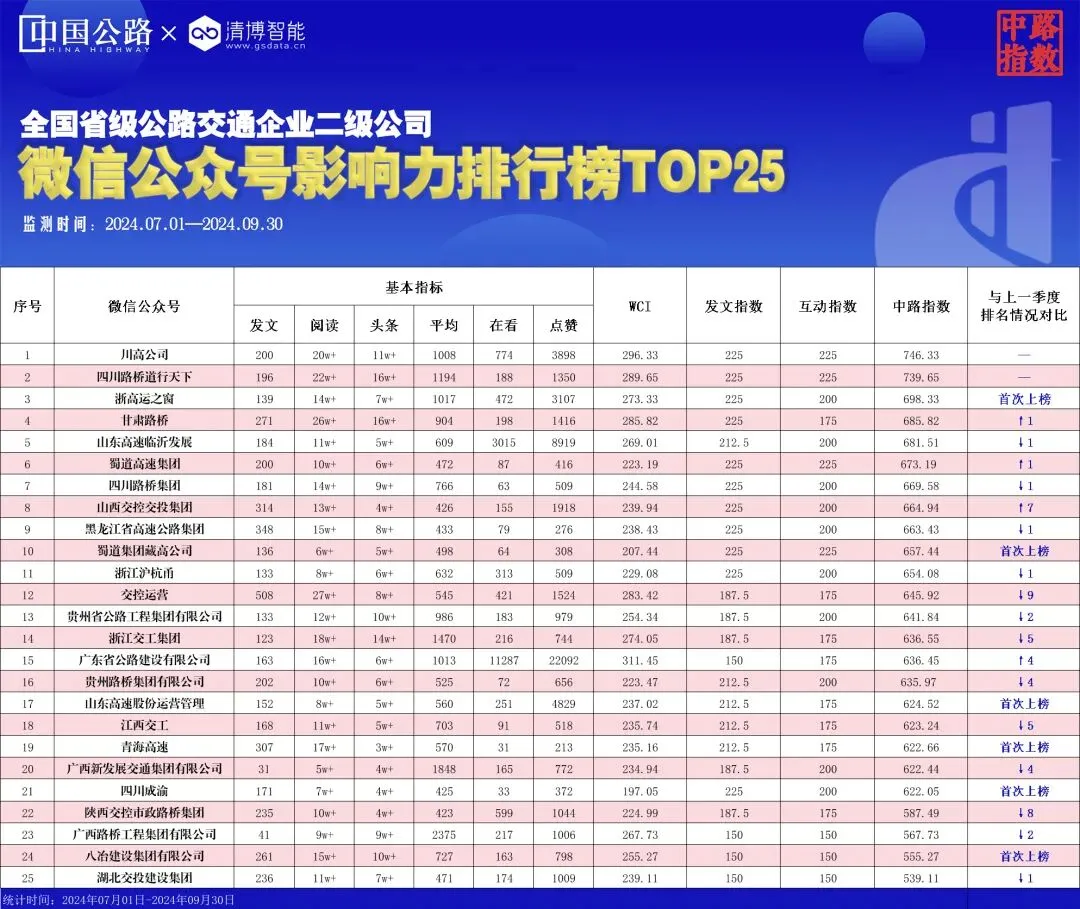 本榜单是根据全国省级公路交通企业及其二级公司(不含港澳台地区),在2024年7月1日0时至9月30日24时期间,在微信公众平台上的发文数据和传播数据,并基于账号的阅读数,转评赞等多维度计算、用户深度反馈及专家建议而推出,用于衡量微信公众号的传播能力,此指数反映该新媒体主体的热度和发展趋势。