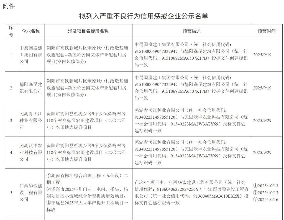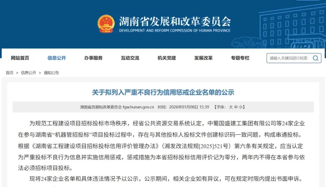 2026年开年,湖南省公共资源交易中心放出一记惊雷:24家参与围标串标的企业被集体查处,直接列入严重不良行为信用惩戒名单,两年内禁止在湖南省参与任何依法必须招标的项目。