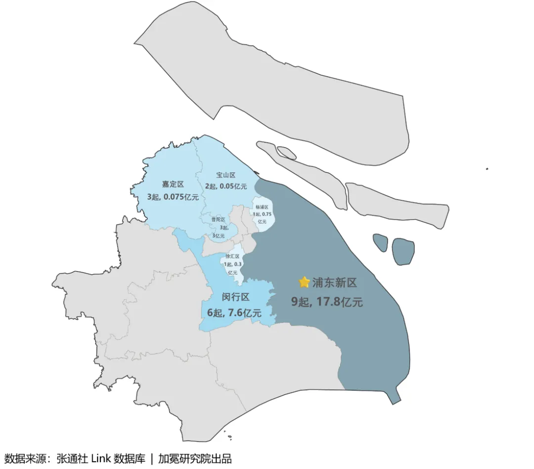 从行政区域分布来看,本周上海共有7个区发生融资事件。浦东新区融资事件数量最多,有9起,其次是闵行区,有6起。其中,浦东新区发生1起15亿元集成电路领域大额融资。