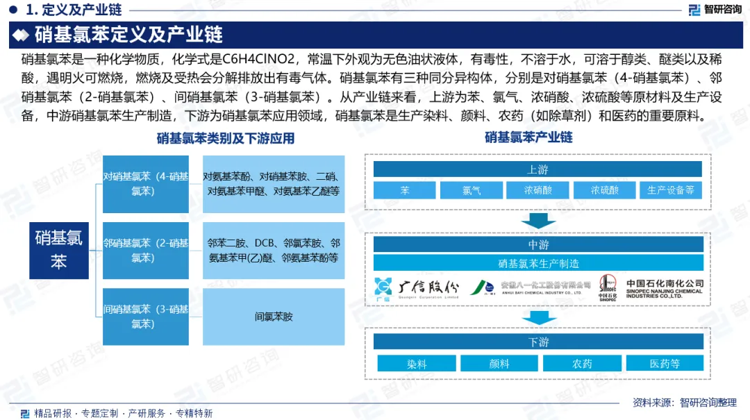 产业链:从硝基氯苯产业链来看,上游为苯、氯气、浓硝酸、浓硫酸等原材料及生产设备,中游硝基氯苯生产制造,下游为硝基氯苯应用领域,硝基氯苯是生产染料、颜料、农药(如除草剂)和医药的重要原料。