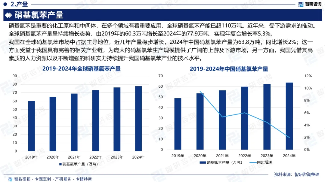 全球产量:硝基氯苯是重要的化工原料和中间体,在多个领域有着重要应用,全球硝基氯苯产能已超110万吨。近年来,受下游需求的推动。全球硝基氯苯产量呈持续增长态势,由2019年的60.3万吨增长至2024年的77.9万吨,实现年复合增长率5.3%。