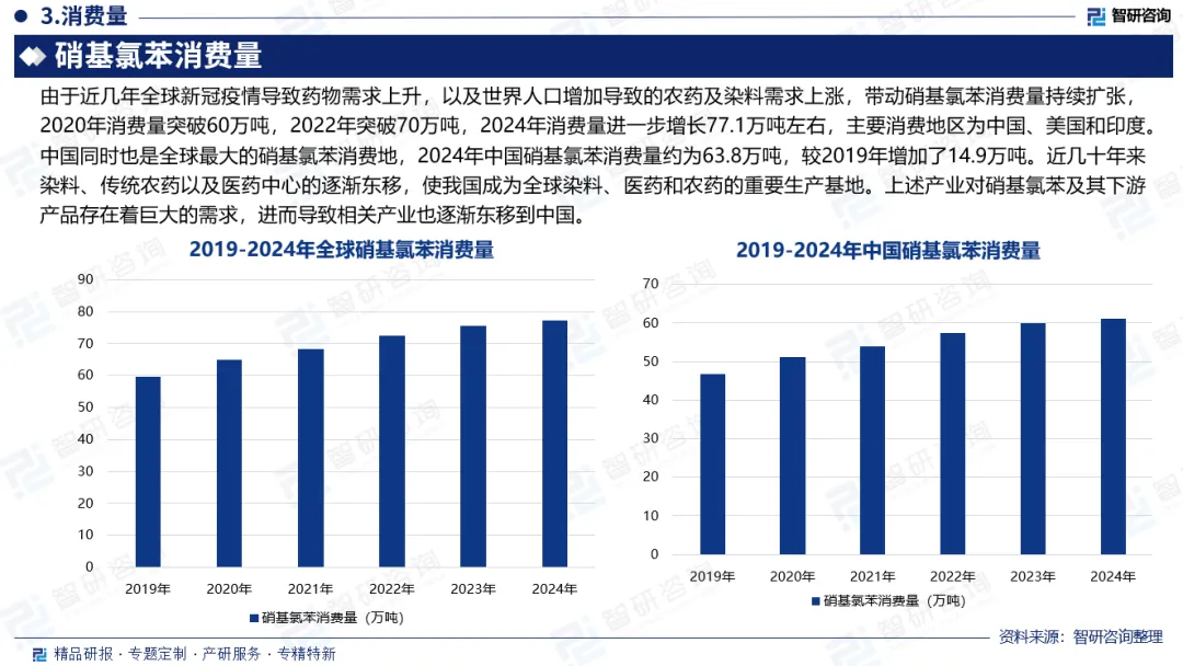 硝基氯苯是重要的化工原料和中间体,是生产染料、颜料、农药(如除草剂)和医药的重要原料。近年来,受下游需求的推动。全球硝基氯苯产量呈持续增长态势,由2019年的60.3万吨增长至2024年的77.9万吨,实现年复合增长率5.3%。我国在全球硝基氯苯市场中占据主导地位,近几年产量稳步增长,2024年中国硝基氯苯产量为63.8万吨,同比增长2%;这一方面受益于我国具有完善的相关产业链,为庞大的硝基氯苯生产规模提供了广阔的上游及下游市场。另一方面,我国凭借其高素质的人力资源以及不断增强的科研实力持续提升我国硝基氯苯产业的技术水平。消费端,由于近几年全球新冠疫情导致药物需求上升,以及世界人口增加导致的农药及染料需求上涨,带动硝基氯苯消费量持续扩张,2020年消费量突破60万吨,2022年突破70万吨,2024年消费量进一步增长77.1万吨左右,主要消费地区为中国、美国和印度。中国同时也是全球最大的硝基氯苯消费地,2024年中国硝基氯苯消费量约为63.8万吨,较2019年增加了14.9万吨。近几十年来染料、传统农药以及医药中心的逐渐东移,使我国成为全球染料、医药和农药的重要生产基地。上述产业对硝基氯苯及其下游产品存在着巨大的需求,进而导致相关产业也逐渐东移到中国。从区域分布来看,我国硝基氯苯的需求大部分都集中在华东地区。这是因为:一方面,国内硝基氯苯产能主要分布在华东,且这些企业的硝基氯苯以自用为主;另一方面,华东地区农药、医药、染料等产业规模较大,硝基氯苯的用量比较大。中国硝基氯苯行业呈现出竞争高度集中的特点,生产企业主要聚集在安徽、浙江、江苏、辽宁和宁夏等地区,生产规模较大的企业有安徽八一化工股份有限公司、安徽广信农化股份有限公司、中国石化集团南京化学工业有限公司、江苏扬农化工股份有限公司、宁夏华御化工有限公司等。