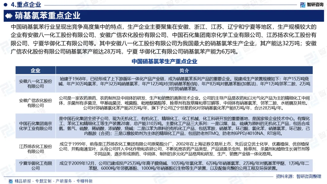 企业格局:中国硝基氯苯行业呈现出竞争高度集中的特点,生产企业主要聚集在安徽、浙江、江苏、辽宁和宁夏等地区,生产规模较大的企业有安徽八一化工股份有限公司、安徽广信农化股份有限公司、中国石化集团南京化学工业有限公司、江苏扬农化工股份有限公司、宁夏华御化工有限公司等。