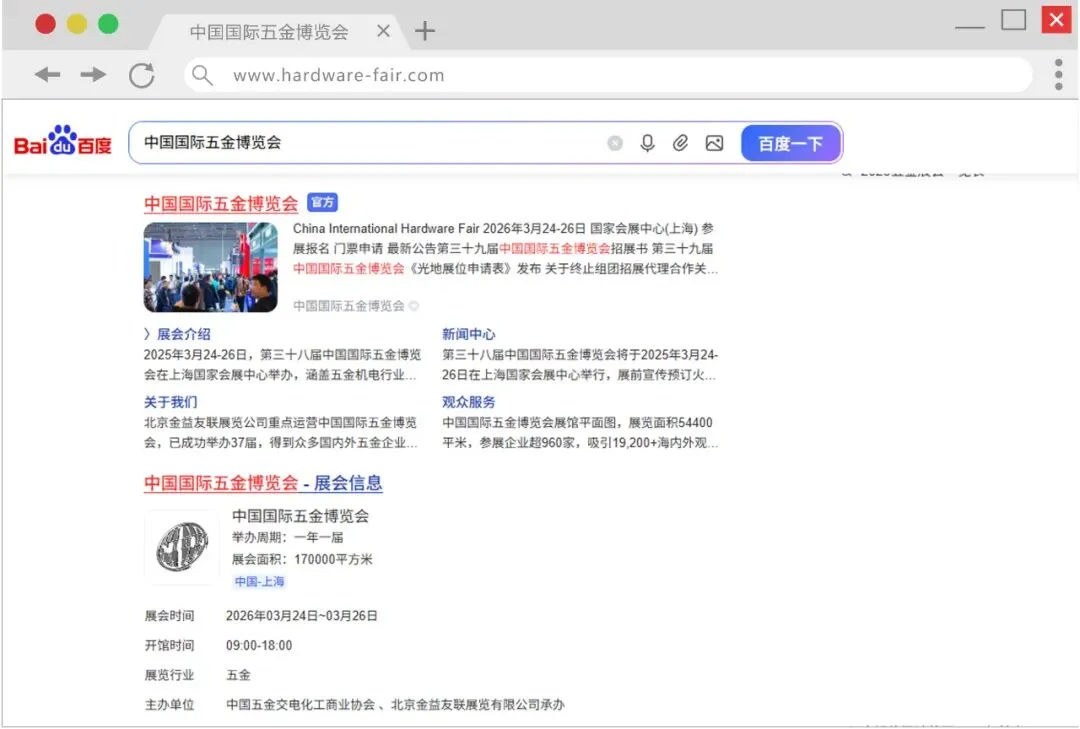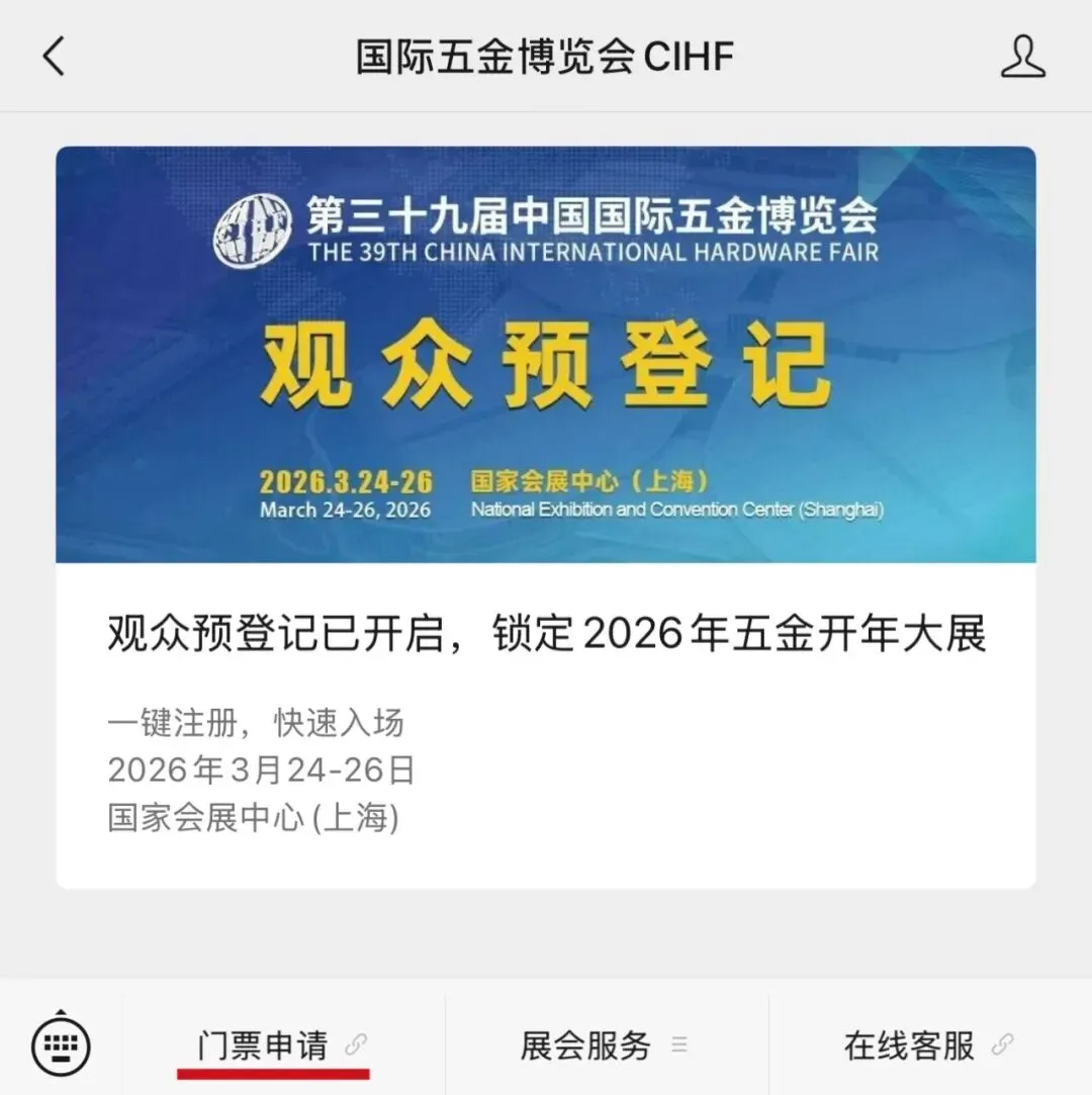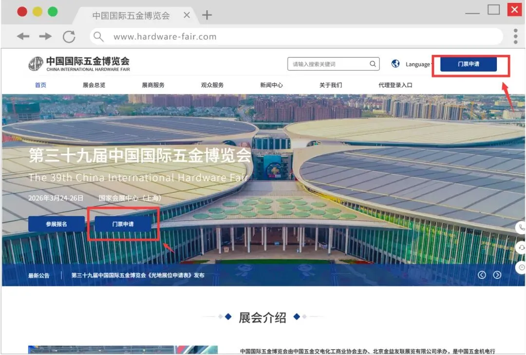 观众可访问展会官方网站 www.hardware-fair.com,或通过百度搜索引擎检索“中国国际五金博览会”,点击带有蓝色“官方”认证标识的链接进入官网首页,随后通过导航栏或页面下方的“门票申请”按钮(如图所示)进入申请页面,填写相关信息并提交申请。入场时请携带本人身份证原件。