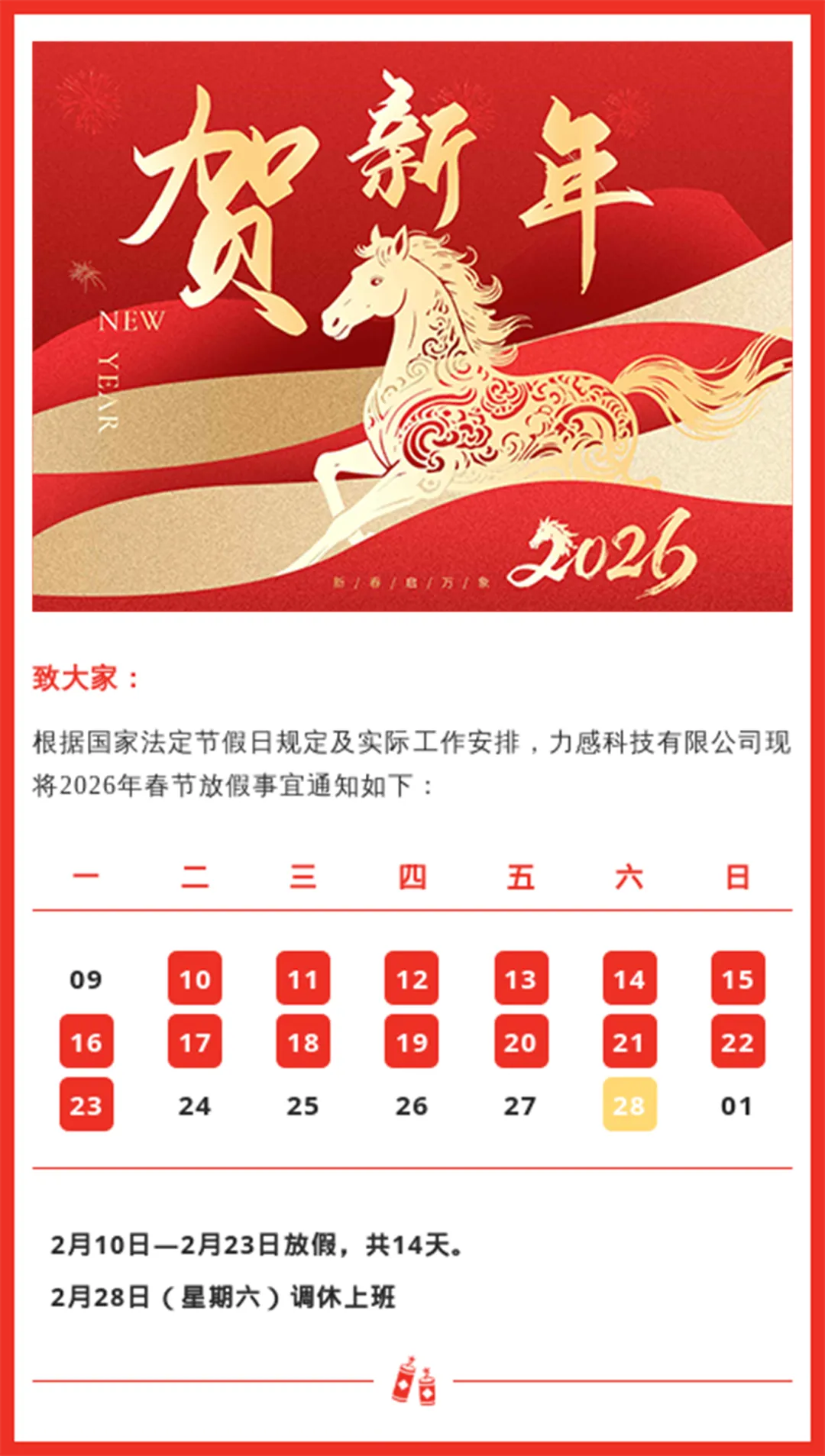 值此新春佳节来临之际,[力感科技有限公司] 全体员工衷心感谢您长期以来的信任与支持。为方便您提前规划,特此奉上我司春节假期安排。同时,我们诚挚地向您发出一份特别的邀请——期待在即将到来的传感器行业盛会上,与您相聚,共创未来。