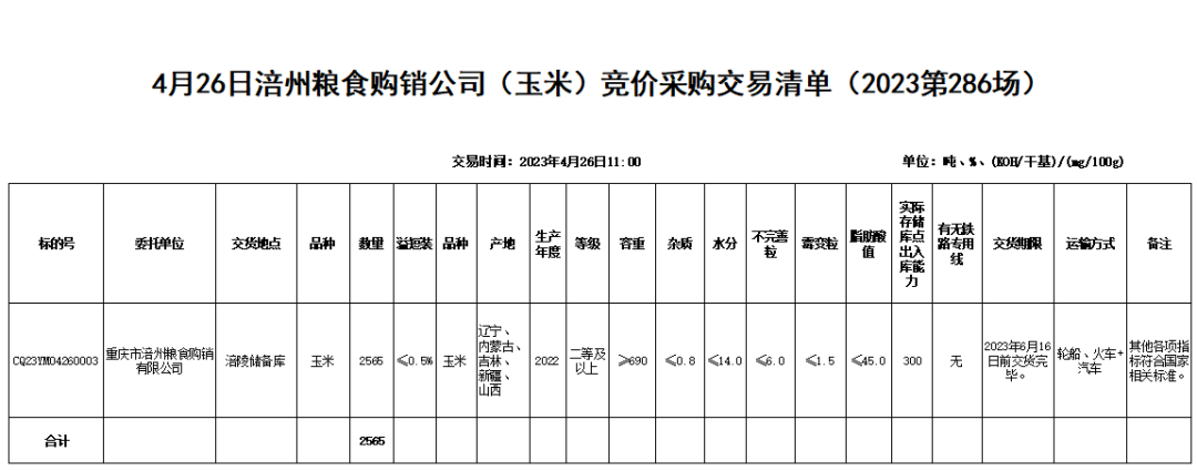 1. 成交价格:到达重庆市涪州粮食购销有限公司涪陵储备库仓前交货价。