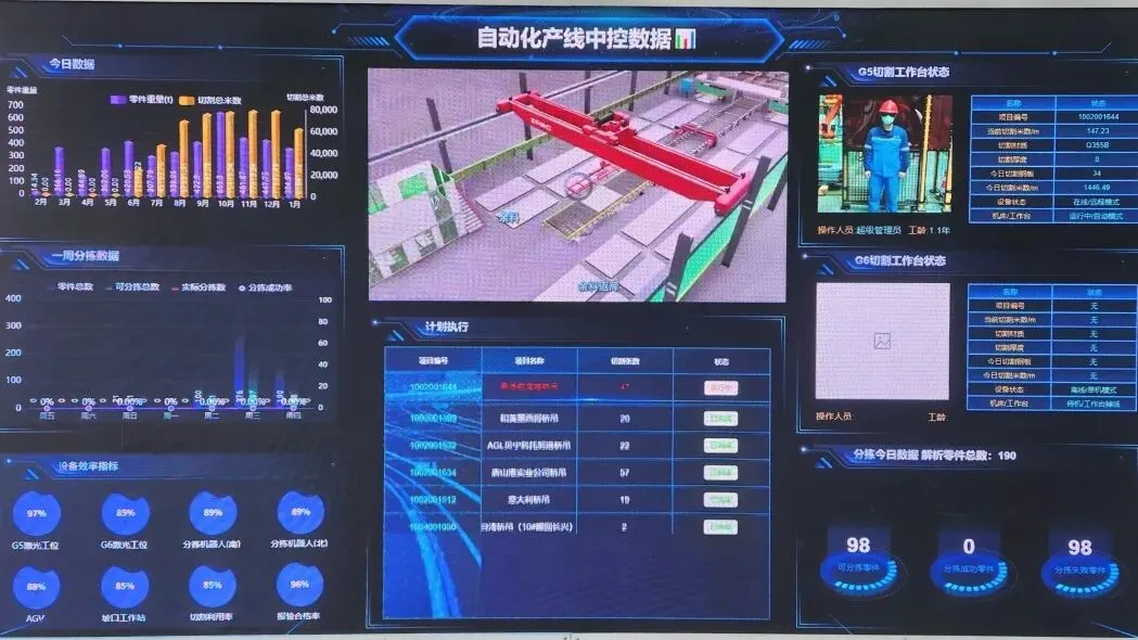 该生产线投运后,实现了全流程自动化作业和数字化管控,生产效率得到显著提升。产线月运行实际切割米数达7.55万米,月平均切割量达596吨。通过创新切割方式,不仅优化了生产流程,也为行业同类定制化重型机械制造企业提供可借鉴方案。