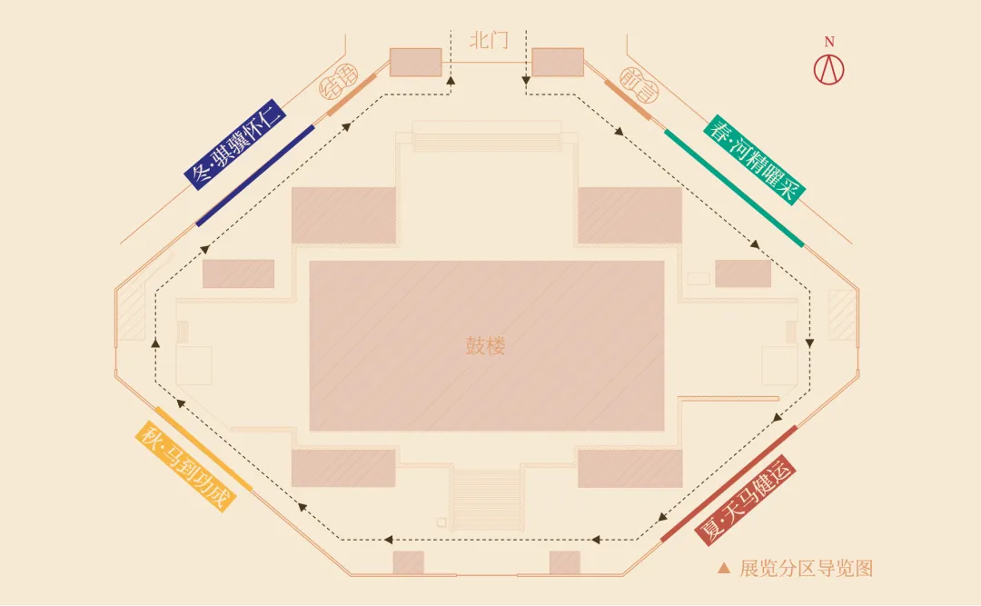 展览以“丙午佳乘,倜傥权奇”为主题,采用环形流线设计,结合钟鼓楼“时间建筑”的特点,依季节更替分为四大主题单元:“春·河精曜采”“夏·天马健运”“秋·马到功成”“冬·骐骥怀仁”。