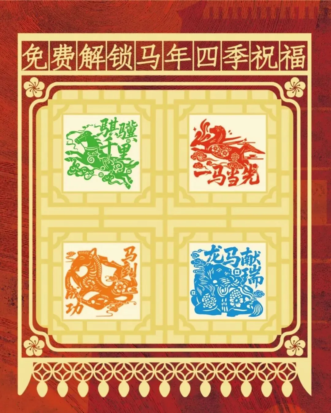 本次展览精心设计了四枚配套的马纹印章,分别对应了马年四季祝福。游客可前往相应地点免费集章,收获来自北京钟鼓楼的马年专属祝福。