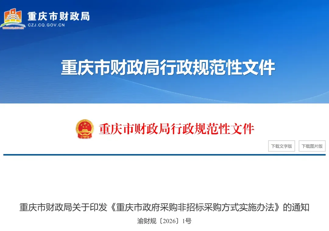 2026年2月2日,重庆市财政局正式印发《重庆市政府采购非招标采购方式实施办法》(渝财规〔2026〕1号),该办法将于 2026年3月1日起正式实施,旨在进一步规范全市政府采购非招标采购活动,健全政府采购监管机制,提升政府采购规范化水平。办法明确了竞争性谈判、单一来源采购、询价和竞争性磋商四种非招标采购方式的适用情形、采购程序、评审要求及合同管理等全流程规范,适用于重庆市行政区域内采购人、采购代理机构采用非招标采购方式采购货物、工程和服务的各类活动。第一条 为加强非招标采购方式采购活动的监督管理,依据《中华人民共和国政府采购法》、《中华人民共和国政府采购法实施条例》(国务院令第658号)、《政府采购非招标采购方式管理办法》(财政部令第74号)、《政府采购竞争性磋商采购方式管理暂行办法》(财库〔2014〕214号)和其他有关规定,制定本办法。第二条 重庆市行政区域内采购人、采购代理机构采用非招标采购方式采购货物、工程和服务的,适用本办法。本办法所称非招标采购方式,是指竞争性谈判、单一来源采购、询价和竞争性磋商采购方式。第三条 采购人、采购代理机构采购以下货物、工程和服务之一的,可以采用竞争性谈判、竞争性磋商、单一来源采购方式采购;采购货物的,还可以采用询价采购方式:(一)依法制定的集中采购目录以内,且未达到公开招标数额标准的货物、服务;(二)依法制定的集中采购目录以外、分散采购限额标准以上,且未达到公开招标数额标准的货物、服务;(三)达到公开招标数额标准、经批准采用非公开招标方式的货物、服务;(四)按照招标投标法及其实施条例必须进行招标的工程建设项目以外的政府采购工程。第四条 符合《政府采购非招标采购方式管理办法》第二十七条规定情形的,可以采用竞争性谈判方式采购。第五条 采购的货物同时符合货物规格、标准统一、现货货源充足、价格变化幅度小条件的,可以采用询价方式采购。第六条 符合下列情形的项目,可以采用竞争性磋商方式开展采购:(二)技术复杂或者性质特殊,不能确定详细规格或者具体要求的;(三)因艺术品采购、专利、专有技术或者服务的时间、数量事先不能确定等原因不能事先计算出价格总额的;(四)市场竞争不充分的科研项目,以及需要扶持的科技成果转化项目;(五)按照招标投标法及其实施条例必须进行招标的工程建设项目以外的工程建设项目。第七条 符合《中华人民共和国政府采购法》第三十一条和《中华人民共和国政府采购法实施条例》第二十七条规定情形的,可以采用单一来源方式采购。第八条 达到公开招标数额标准的货物、服务采购项目,拟采用非招标采购方式的,采购人应当在采购活动开始前,报经主管预算单位同意后,按照所属预算级次向本级财政部门申请批准。第九条 根据本办法第八条申请采用非招标采购方式采购的,采购人应当向财政部门提交以下材料并对材料的真实性负责:(一)采购人名称、采购项目名称、项目概况等项目基本情况说明;(二)项目预算金额、预算批复文件或者资金来源证明;第十条 谈判文件、询价通知书应当包括供应商资格条件、采购邀请、采购方式、采购预算、采购需求、采购程序、价格构成或者报价要求、响应文件编制要求、提交响应文件截止时间及地点、保证金交纳数额和形式、评定成交的标准等。谈判文件除本条第一款规定的内容外,还应当明确谈判小组根据与供应商谈判情况可能实质性变动的内容,包括采购需求中的技术、服务要求以及合同草案条款。磋商文件应当包括供应商资格条件、采购邀请、采购方式、采购预算、采购需求、政府采购政策要求、评审程序、评审方法、评审标准、价格构成或者报价要求、响应文件编制要求、保证金交纳数额和形式以及不予退还保证金的情形、磋商过程中可能实质性变动的内容、响应文件提交的截止时间、开启时间及地点以及合同草案条款等。第十一条 谈判文件、磋商文件、询价通知书应当根据采购项目的特点和采购人的实际需求制定,并经采购人书面同意。采购人应当以满足实际需求为原则,不得擅自提高采购标准。第十二条 谈判文件、磋商文件、询价通知书规定供应商的资格条件不得具有倾向性和歧视性,不得要求或者标明供应商名称或者货物的品牌、产地或者特定货物规格、型号等,不得含有指向特定供应商的技术、服务等条件。第十三条 谈判文件、磋商文件、询价通知书规定的采购项目实质性要求,不得与采购项目一般技术和商务要求存在歧义或矛盾。存在歧义或矛盾的,应当按照规定进行修改或者澄清。第十五条 竞争性谈判、询价、竞争性磋商采购活动中,采购人、采购代理机构应当通过下列方式之一邀请供应商:(二)从省级以上财政部门建立的供应商库中随机抽取;前款规定中的第(一)项应当作为采购人、采购代理机构邀请供应商的主要方式。第十六条 采购人、采购代理机构采取发布公告邀请供应商的,应当在重庆市政府采购网发布采购公告。采购公告应当包括下列内容:(一)采购人、采购代理机构的名称、地址、联系人和联系方式等;(二)采购项目的名称、数量、简要规格描述或项目基本概况介绍;(六)供应商获取文件的时间(应当明确日、时)、地点、方式、售价等;第十七条 采购人、